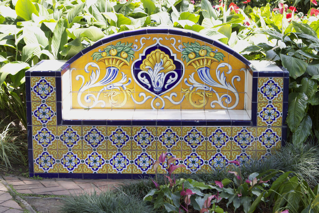 Las banquetas del norte (amarillas) destacan por su respaldo de medialuna con un mural de estilo victoriano y la presencia de una cenefa de azulejos que se repiten engalanados con trepas florales que reproducen la imagen de la hiedra, en representación de la humildad y la perseverancia. El mural del respaldo, realizado sobre los azulejos, muestra una concha de nácar abierta coloreada en amarillo de antimonio y tres perlas, símbolo de modestia y pureza. También se observan dos cornucopias o cuernos de la abundancia de estilo victoriano sobre los que se aprecian tres duraznos, símbolo de prosperidad y afluencia de riquezas.